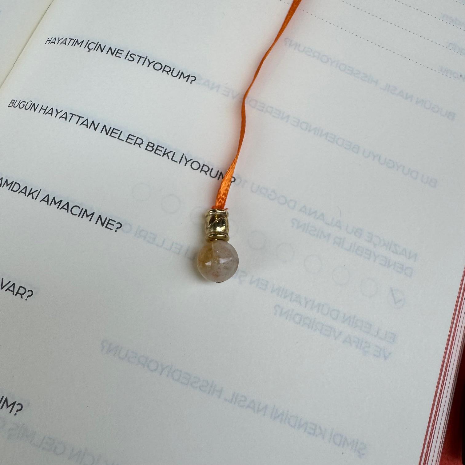 Defterin kapağında Sri Yantra sembolü, ayıraç ipinin ucunda gerçek, doğal sitrin taşı, yanında telefon tutuculu kalem ile birlikte gelmektedir.