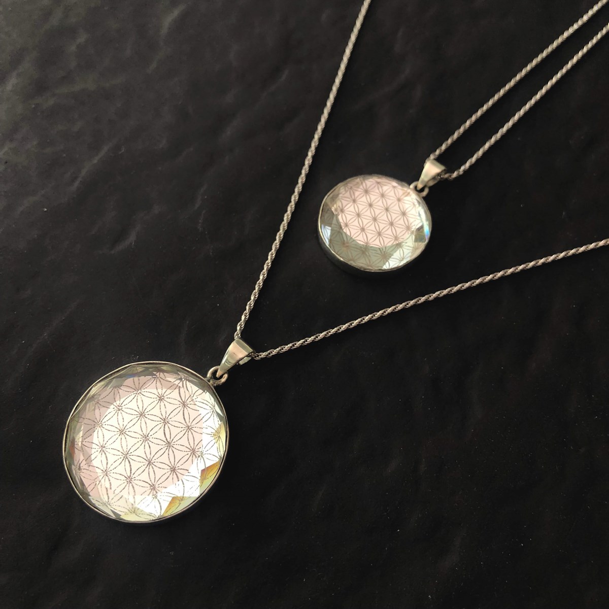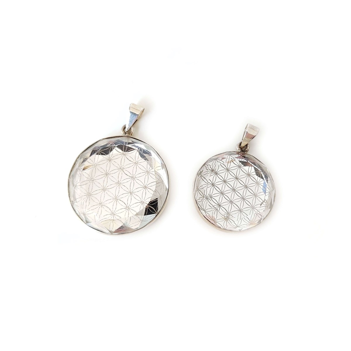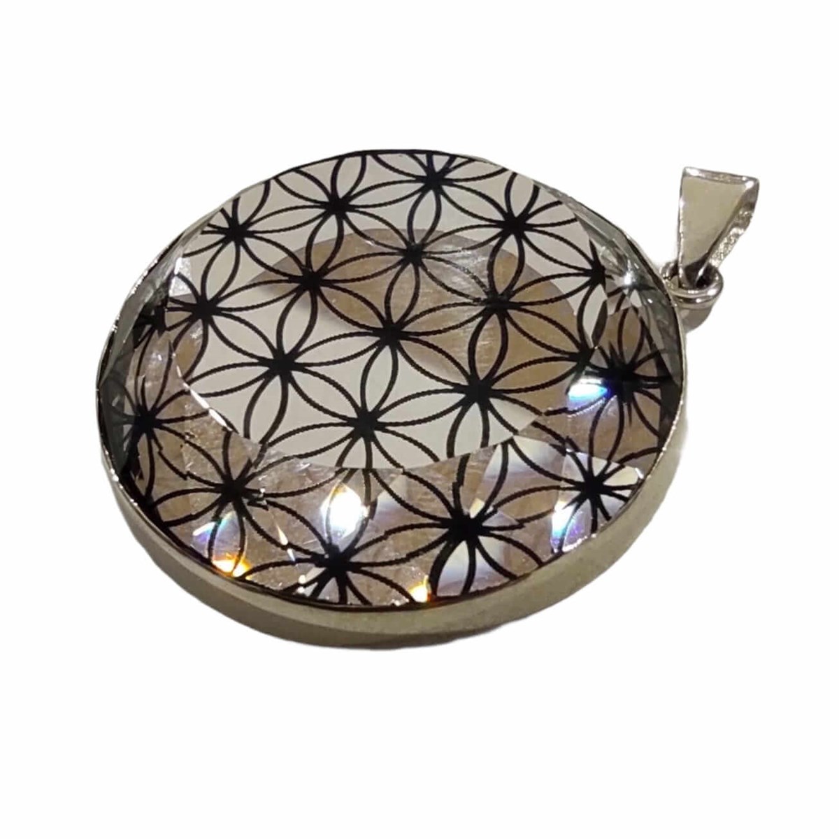 Arkası 925 ayar gümüş, larentia kesimli, yuvarlak aynalı Yaşam Çiçeği kolye ucu.