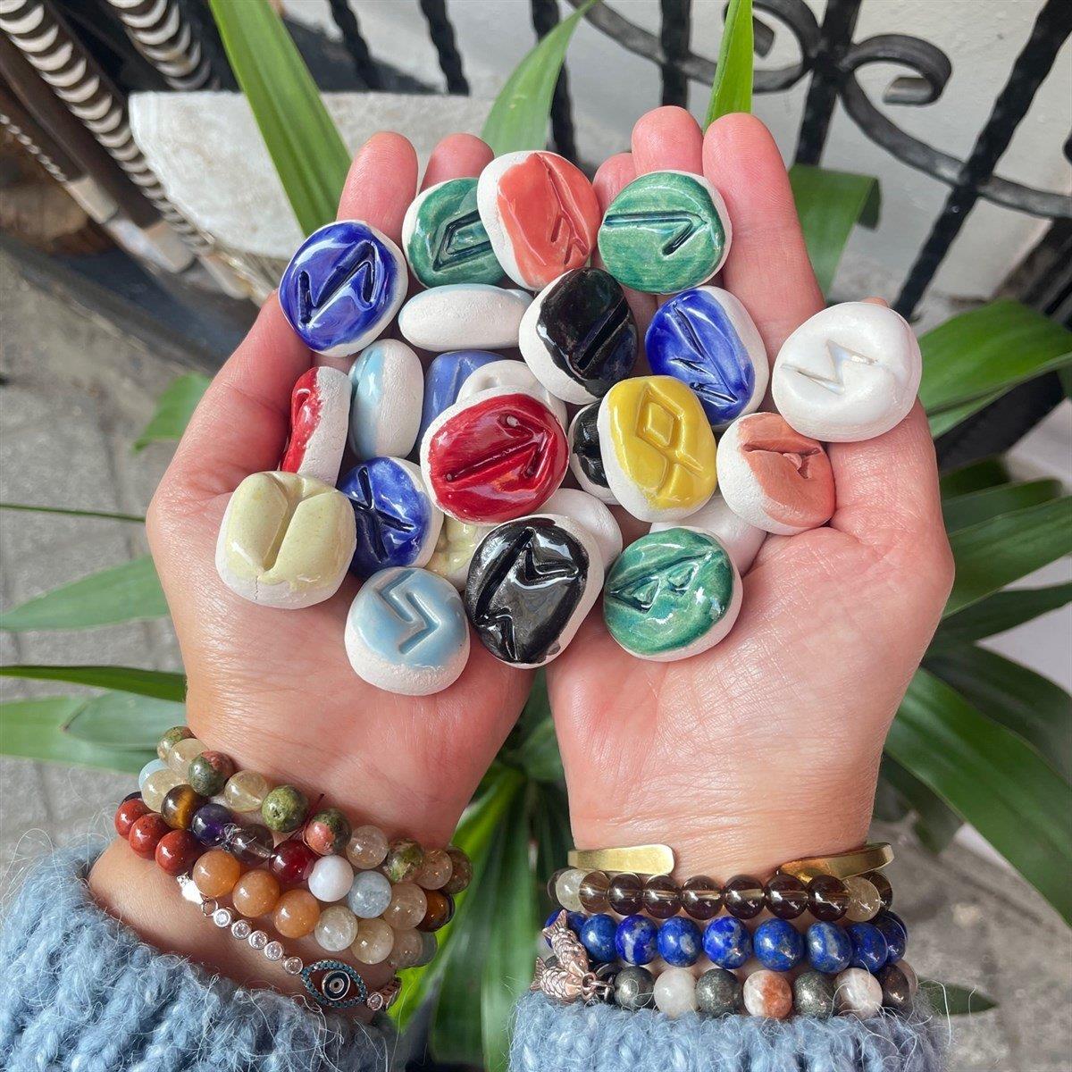 Ancak bu gerçek anlamından çok uzaktır. Bu sadece bir harf değil, daha çok "gizli" ve "sır" anlamına gelen bir semboldür. Rune’lar sembollerin gerçek anlamını bilen ve güçlerini anlayan bir kişi tarafından yapılmalıdır. Rune’ların gücünü güvenli bir şekilde günlük hayatınıza getirmek için tılsımlar hazırladık. ᚨ - Ansuz 1. Zihnin ve zekanın gücünü kullanmanıza yardımcı olur. 2. İlham bulmanıza yardımcı olur. 3. Manyetik ve ikna edici konuşmayı edinmenize yardımcı olur. 4. Bilgeliğinizi kullanmanıza yardımcı olur. ᚹ - Wunjo 1. Mutluluk ve neşe konusunda yardımcı olur. 2. Pozitif duyguları ve memnuniyeti yaşamanıza yardımcı olur. 3. Şans ve başarı getirir. ᛒ - Berkano 1. Büyüme konusunda yardımcı olur. 2. Kadınlık ifadesinde yardımcı olur. 3. Kadınlara ilişki kurmada yardımcı olur. ᚠ - Fehu 1. Kişisel gelişim için 2. Kişisel maddi varlığın artışı. 3. Zaten elde edilmiş kaynağın artışı için yardımcı olur ᛏ – Tiwaz 1. Adil zafer ve başarının elde edilmesi. 2. Ruhsal iradenin inşası. 3. Adaletli ve uygun bir şekilde hedef koyulmasında yardımcı olur ᚢ-Uruz 1. Canlandırıcı gücü geri kazanmaya yardımcı olur. 2. Zihinsel ve fiziksel sağlığın iyilik hali ve korunması. 3. Kullanıcıya daha fazla yaşam gücü getirir. ᚦ-Thurizas 1. Daha fazla kararlılık için. 2. Hedefe giden yolda engelleri aşmak için. 3. Savunma ve zafer için. ᚱ-Raido 1. Kişisel ve dünya ritimleriyle uyum sağlamak için. 2. Güvenli seyahat için. 3. Doğru ve doğal bir karar vermek için. ᚲ-Kenaz 1. Daha önce göremediğiniz şeyler hakkında bilgi edinmek için. 2. Sezgileri geliştirmek için. 3. Daha fazla dikkat ve odaklanma için. ᚷ-Gebo 1. Herhangi bir alanda ortaklıklar kurmak için. 2. Karşılıklı değişimlerin gerçekleştiği anlaşmalara ulaşmak için. 3. İlişkilerde uyum için. ᛃ-Jera 1. Bereket ve yaratıcılık için. 2. Çabalarınızın ve önceki eylemlerinizin sonuçlarını elde etmek için. 3. Hayatın döngüsel doğasını anlamak için. ᛈ-Perthro 1. Daha derin bir seviyede bilgelik ve bilgi edinmek için. 2. Anıları hatırlamak için. 3. Yeni fikirler geliştirmek için. ᛉ-Algiz 1. Güçlü korunma için. 2. Olumsuz etkilerden kendinizi korumak için. 3. Yolunuzda rehberlik ve yönlendirilmek için. ᛋ-Sowilo 1. Kendi bütünlüğünüzü ve kimliğinizi hissetmek için. 2. Daha belirgin ve göz önünde olmak için. 3. Sizi bir örnek olarak algılamaları için. ᛚ-Laguz 1. Duyguları yeni bir seviyede hissetmek için. 2. Sezginizi geliştirmek ve onu dinlemeyi öğrenmek için. 3. Kadınsı bilgelik edinmek için. 4. İkinci görüş geliştirmek için. ᛜ / ᛝ-Ingwaz 1. Etkili çalışma ile isteklerinizi maksimum seviyeye çıkarmak için. 2. Refah için. 3. Gücünüzü artırarak hedeflere ulaşmak için. ᛟ-Othala 1. Ailede uyum ve barış için. 2. Ailenizin ortak çıkarlarına odaklanmak için. 3. Geçmiş nesillerden mistik güç toplamak için. ᛇ-Eihwas 1. Manevi dayanıklılığın ve sert iradenin gelişimi. 2. Manevi yaratıcılık ve görüş. 3. Zararlı güçlerden korunma. 4. Kişisel güçte genel bir artış. Bu tılsımların gücünden yararlanmak için, onlara dokunmanız ve yanınızda taşımanız, günlük olarak onlara bakarak Runeların anlamını düşünmeniz yeterli olacaktır. Malzeme: Kil Ölçü: 2x2.5 cm NOT: 1 Adet fiyatıdır. İstediğiniz sembolü Notlar bölümüne yazmanızı rica ederiz.