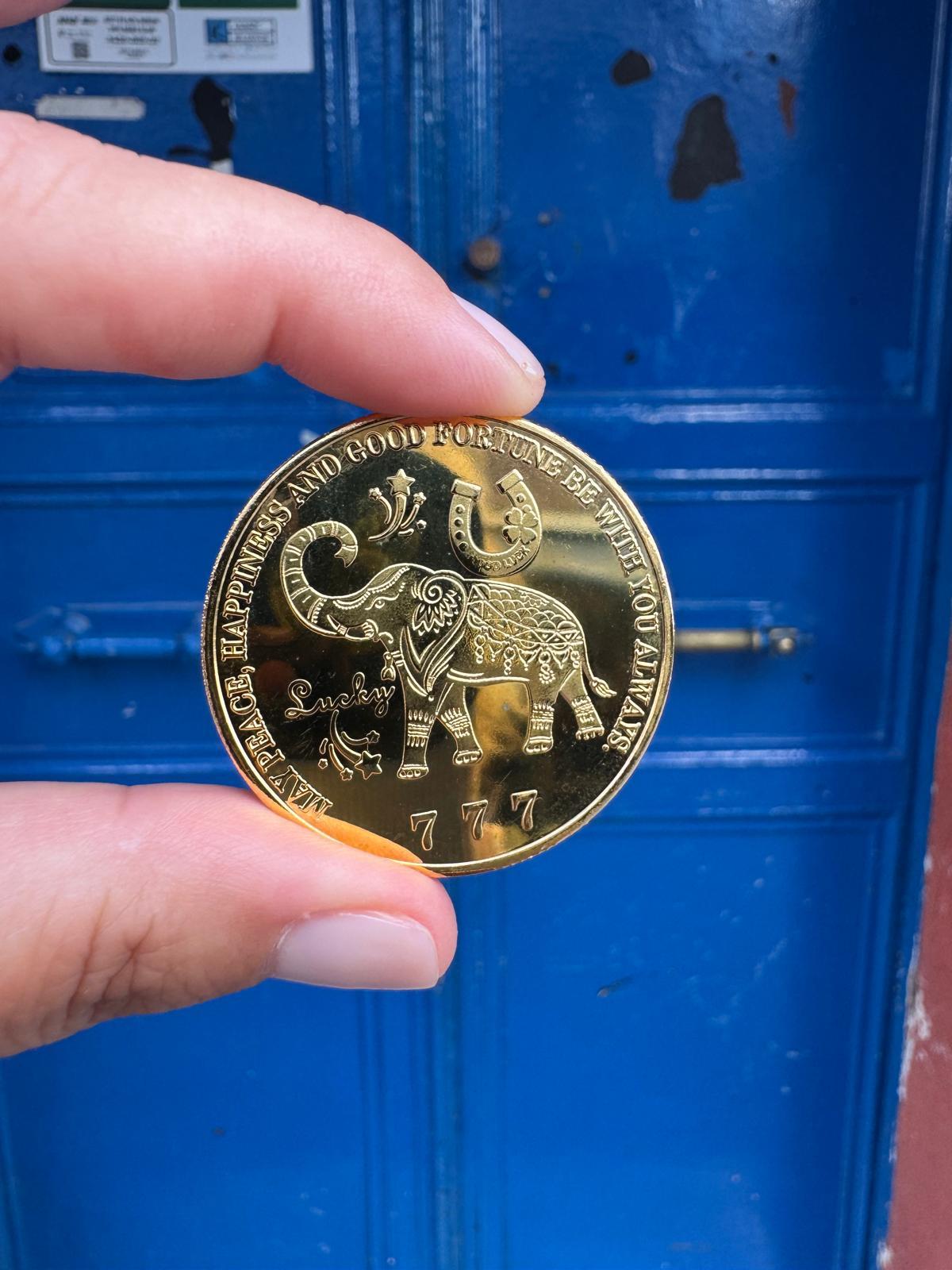 Bir yüzünde geleneksel desenlerle süslenmiş “şans fili”, uğur getirdiğine inanılan nal ve 777 sembolleriyle birlikte yer alıyor.