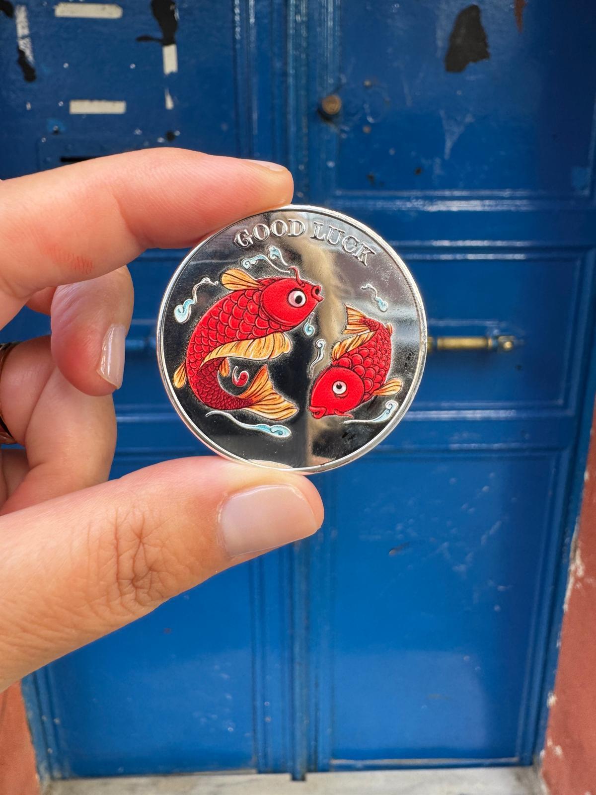 Diğer yüzünde ise "Lucky Fish" (Şans Balığı) yazısı ve iki renkli koi balığı bulunur.