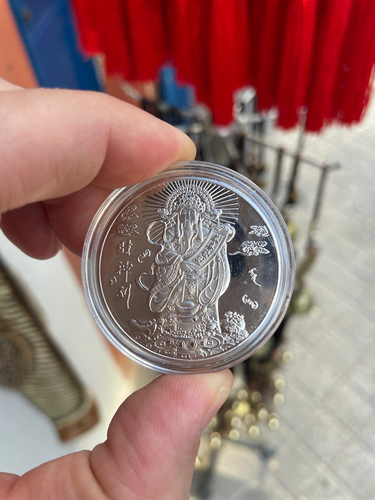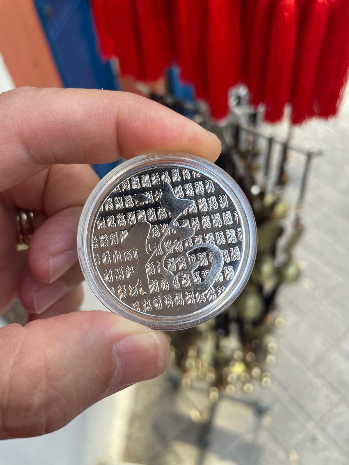 Bu gümüş renkli özel koleksiyon paraları, Çin kültüründe zenginlik tanrısı "Cai Shen" (财神) ve "Fu" (福) karakterleriyle süslenmiştir.